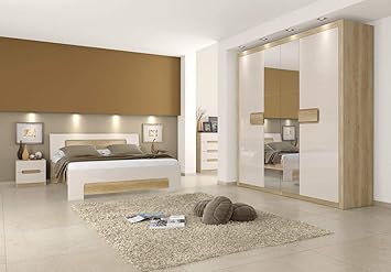 Schlafzimmer Komplett Set A Satalo 5 Teilig Farbe Eiche Braun Creme Hochglanz Amazon De Baumarkt