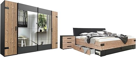 Lifestyle4living Schlafzimmer Komplett Set In Plankeneiche Dekor Und Graphit 4 Teilig Komplettset Mit Kleiderschrank Bett Und Nachtschranken Im Industrial Stil Amazon De Kuche Haushalt