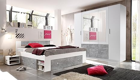 Moebel Guenstig24 De Schlafzimmer Komplett Set 4 Tlg Stefan Bett 180 Kleiderschrank 212 Cm Nachtkommoden Weiss Grau Beton Amazon De Kuche Haushalt