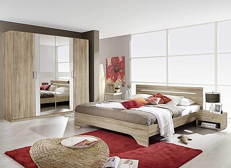 Avanti Trendstore Rubi Schlafzimmermobel Komplett Aus Laminiertem Sanremo Eiche Hell Weiss Inkl Bettgestell Mit 2 Nachtschrankchen Und Schrank Mit Spiegel Amazon De Kuche Haushalt